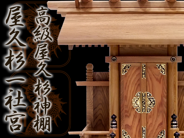 屋久杉特有の木目と色、そして重厚感のある厚い屋根板で、存在感と高級感のある一社宮を作りました。